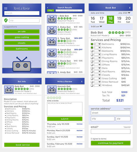 Futuristic app development. Rent a Rosie (robot) to do every day chores.